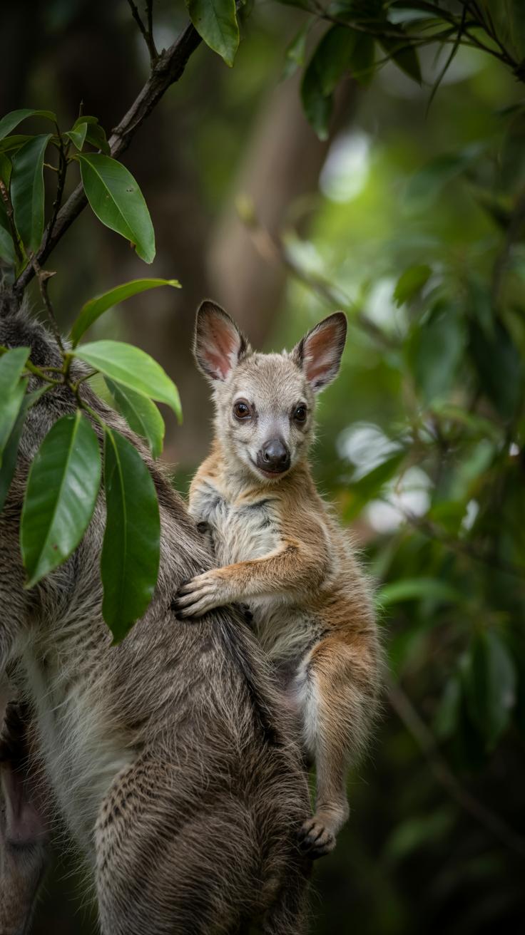 Over the next six months, the joey continues to grow inside the pouch, slowly developing fur and beginning to open its eyes. Once it is strong enough, the curious joey starts to venture out of the pouch for short periods. During these exploratory adventures, it will cling tightly to its mother’s back, learning vital skills for survival in the eucalyptus canopy. These early experiences not only shape the joey’s physical development but establish a foundation for its future independence.