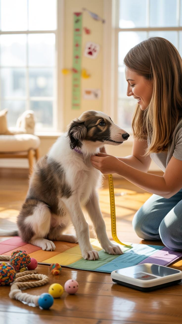 Exercise should be gentle and controlled; Borzoi puppies have delicate joints, so short play sessions with soft toys work better than high-impact activities. Vet visits should not only cover vaccinations but also growth tracking. Regular weigh-ins help spot any sudden dips or jumps that might signal a problem.