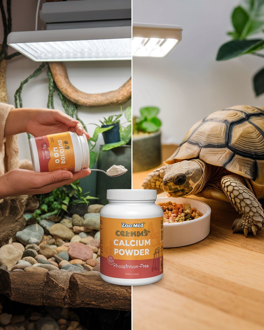 Calcium carbonate supplements, like Zoo Med and Rep-Cal, are easy to sprinkle onto tortoise food for consistent nutrient intake.