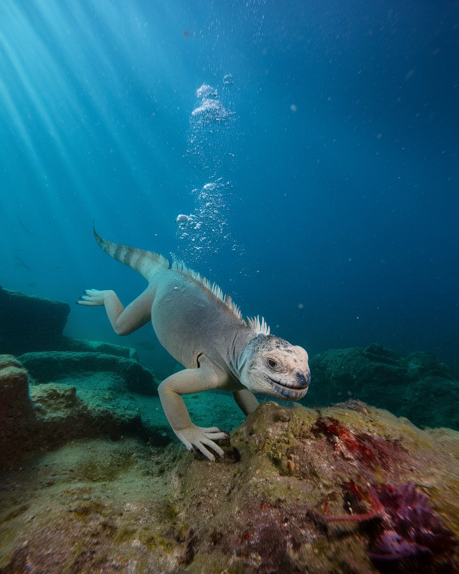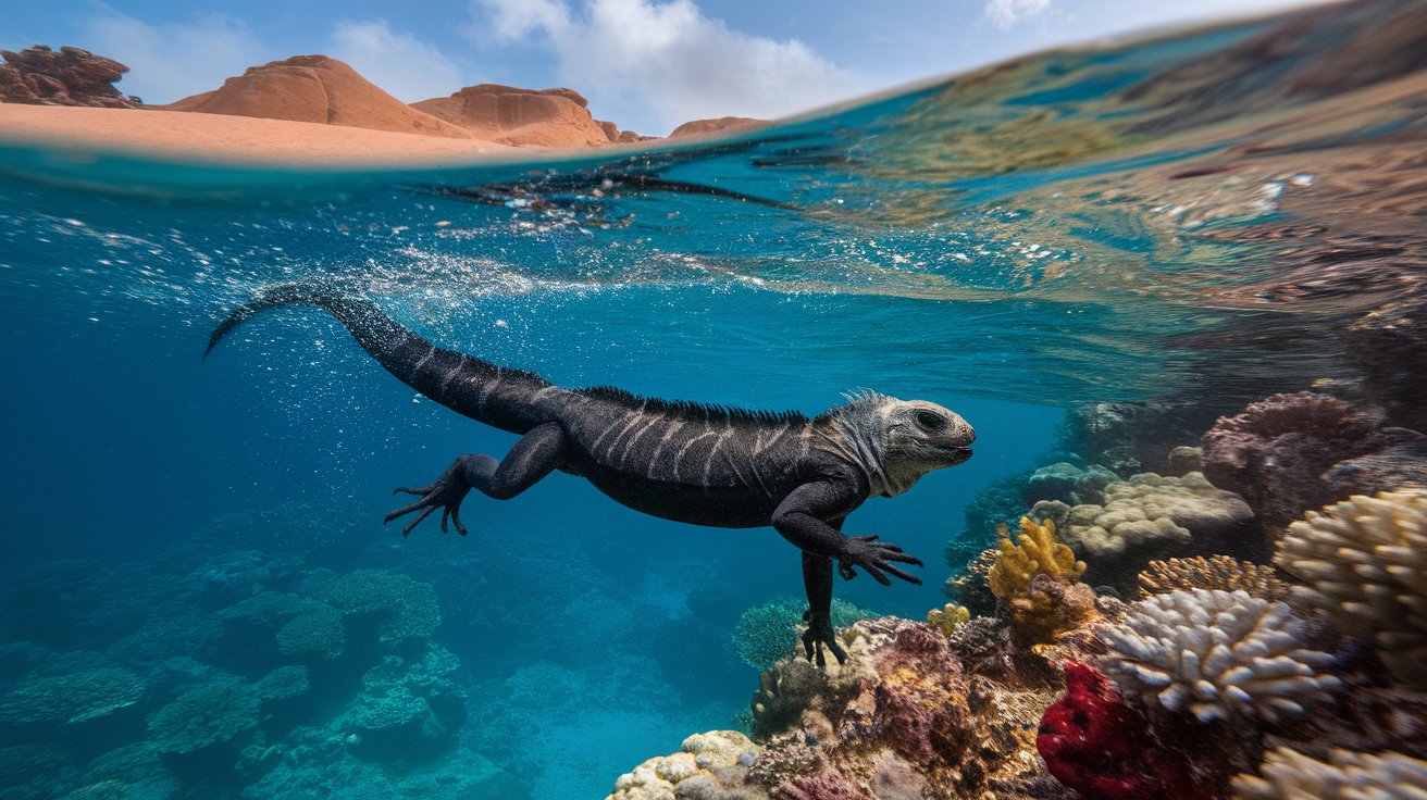 6. Marine iguanas dive deep to forage for algae, demonstrating their aquatic adaptations.