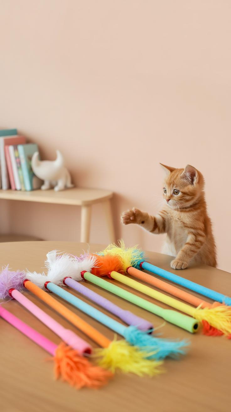 Feather wands probably top the list for many cat owners. They mimic prey movement and encourage jumping and pouncing. Laser pointers are simple and portable, tempting cats to chase invisible “prey” but often require you to keep the game brief to avoid frustration.