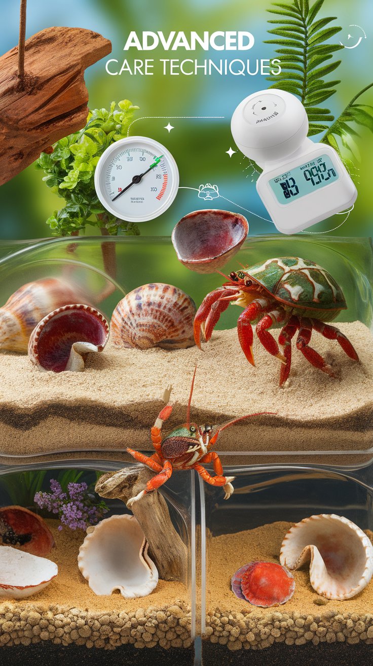 Technology can help maintain precise conditions in a hermit crab tank. Use a hygrometer to track humidity levels and a digital thermometer for accurate temperature readings. Automated misting systems ensure consistent humidity, while heat lamps maintain stable temperatures. Incorporating these tools makes advanced care more manageable and creates an ideal habitat for your hermit crabs.