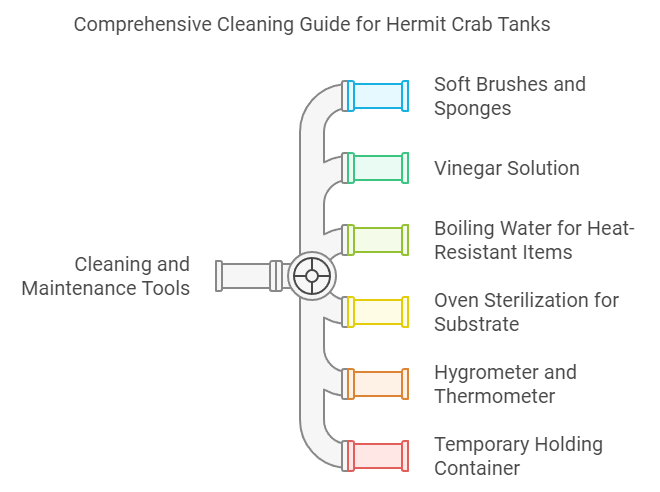 Using the right tools and cleaners makes tank maintenance easier and safer. Soft brushes and sponges are ideal for scrubbing tank walls and decorations. A mild vinegar solution works well for sterilizing without introducing harmful chemicals. Invest in a reliable hygrometer and thermometer to monitor tank conditions. For sterilizing shells and substrate, boiling water and an oven set to 350°F are effective. Keeping these tools handy simplifies cleaning and ensures optimal conditions for your hermit crabs.
