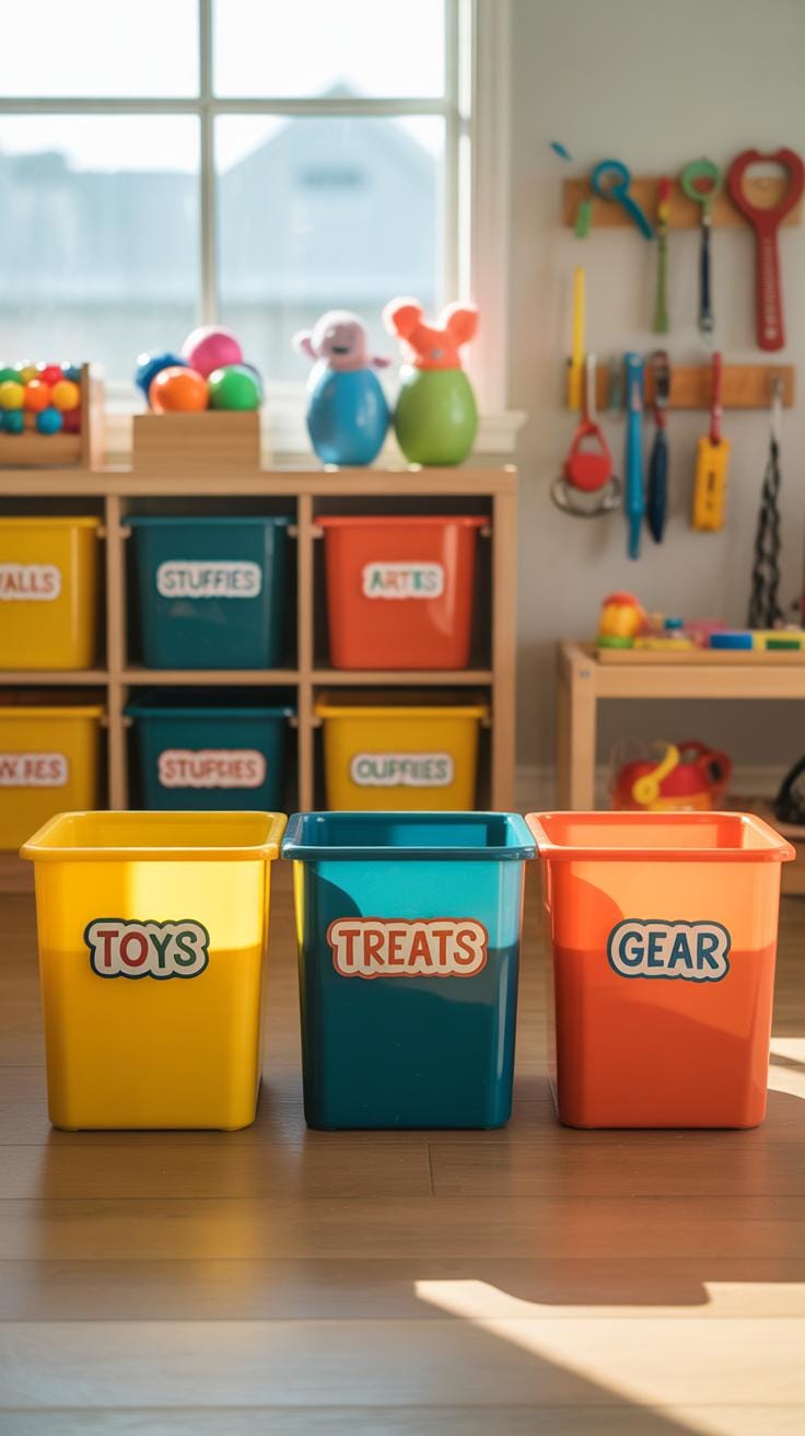 - Bins with lids: Perfect for toys or treats, especially if your dog loves to get into things. Clear plastic bins let you see what’s inside without opening every lid, which saves time.