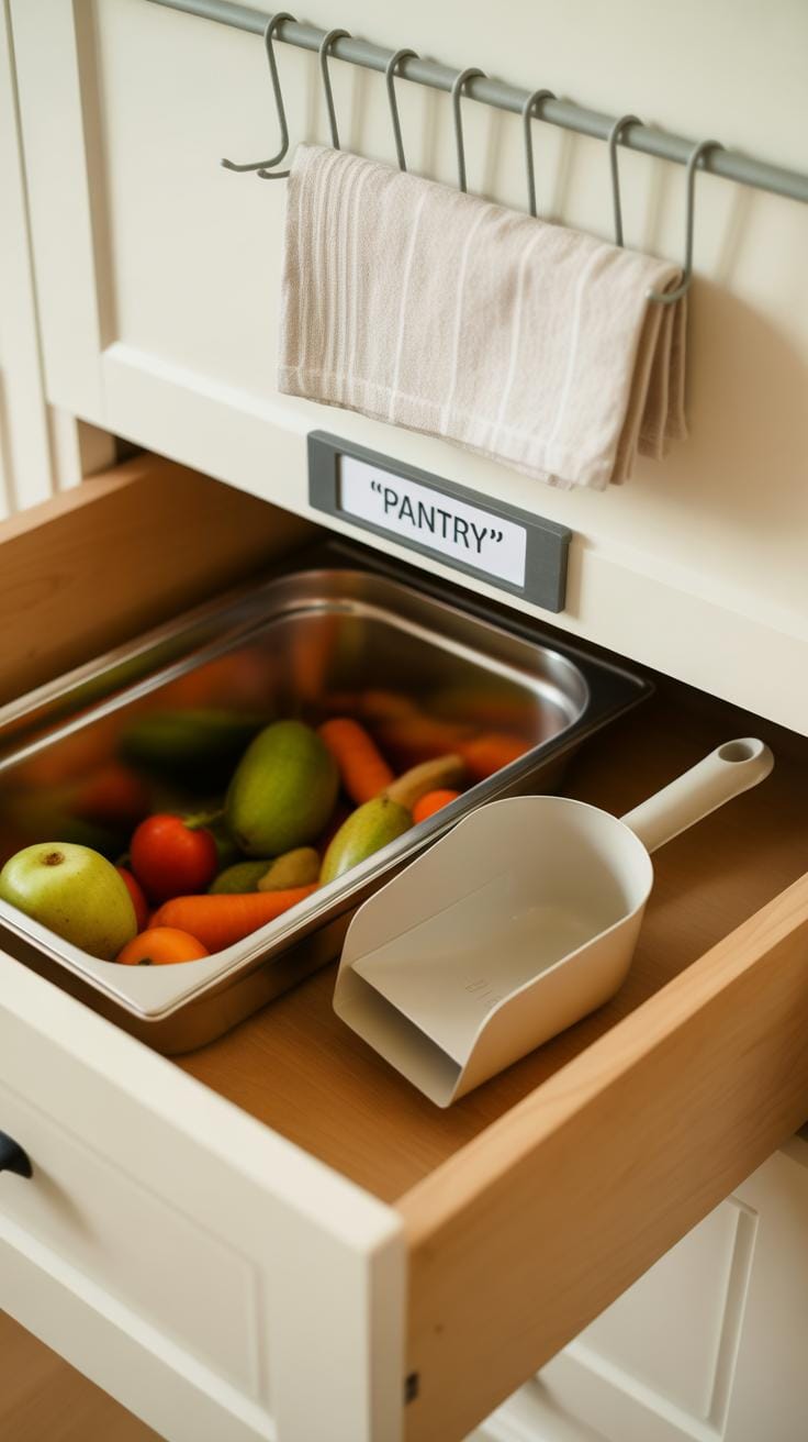 Keeping dog food, treats, and cleaning supplies close to the feeding station makes a big difference in maintaining order. When everything is within arm’s reach, you’re less likely to create extra mess running back and forth. You might try a small cabinet or shelving unit right beside the station. Open shelves are good if you want easy access, but cabinets with doors can hide clutter if you’re not the tidiest.
