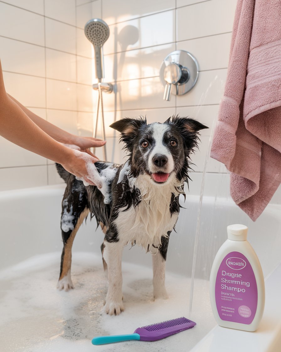 - Bathing your dog with products formulated specifically for dogs prevents skin irritation and keeps their coat clean and shiny.