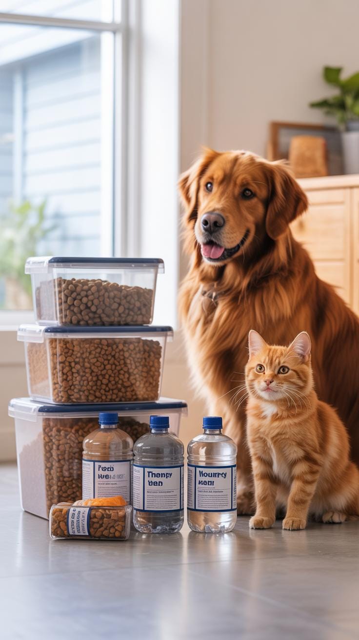 Safe water storage also demands attention. Pets, like us, need steady access to clean water. Store at least three days’ worth, roughly a gallon per pet per day, and consider rotating supplies every six months. Use food-grade containers and keep them in a cool, dark place to prevent contamination. You might wonder about water purification methods during extended emergencies—having pet-safe water purification tablets on hand can be a practical solution, though many experts argue that pre-stored water is more reliable than on-the-spot treatment.