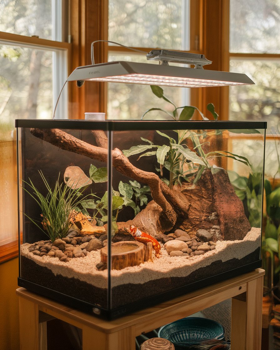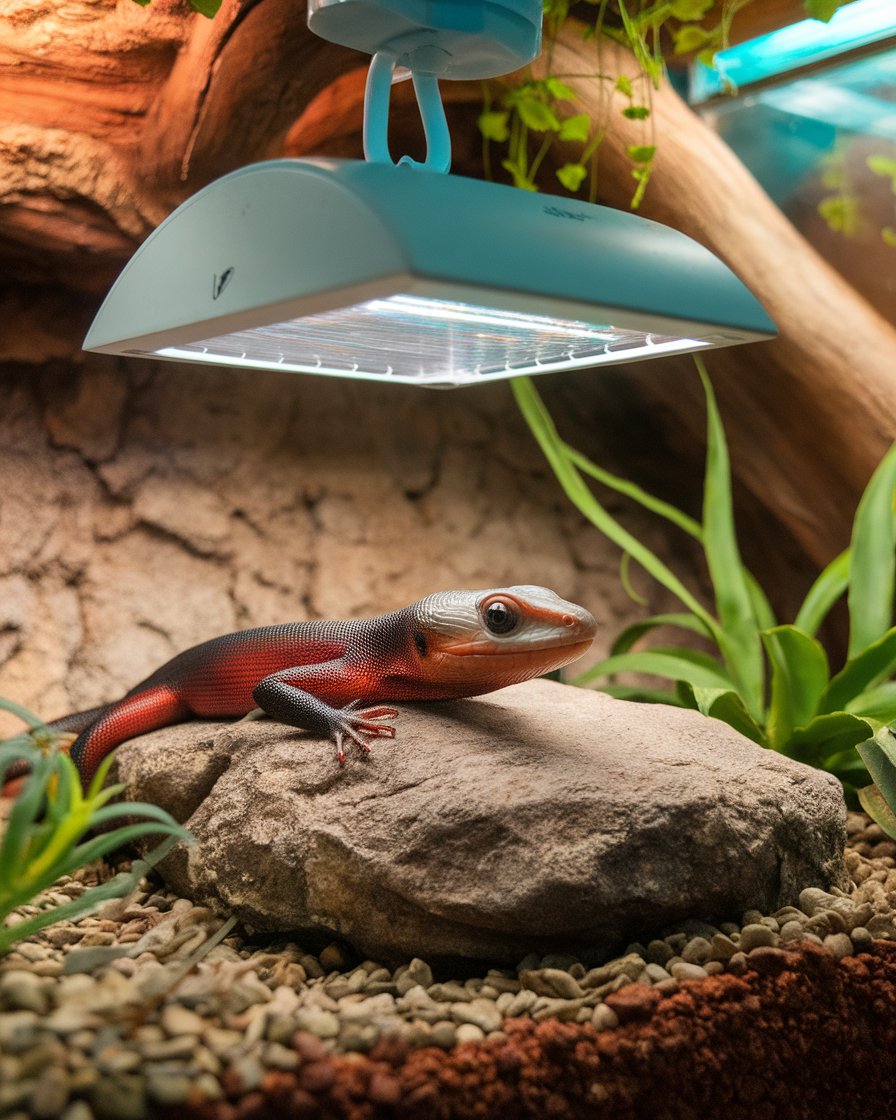 Fire skinks benefit from a well-lit enclosure with a balanced light schedule that mimics their natural habitat.