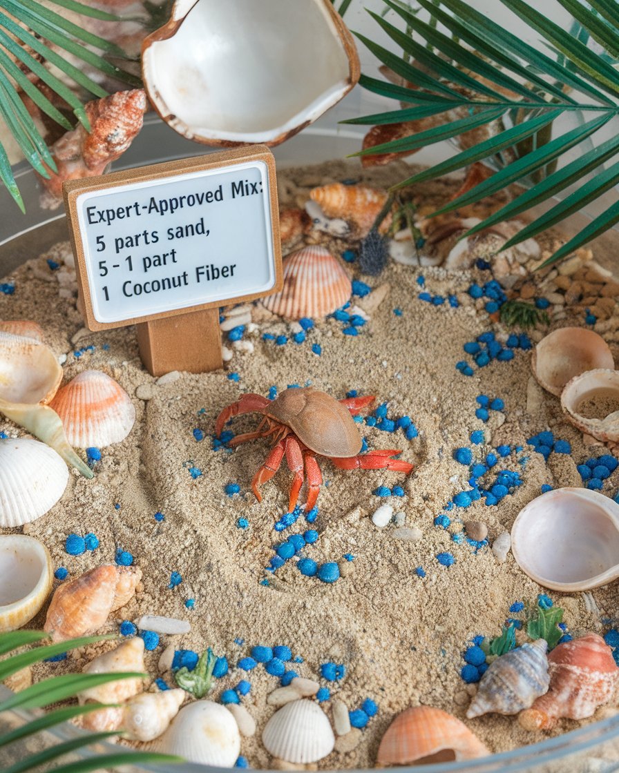 - Expert-recommended mixes, like a 5:1 sand to coconut fiber ratio, provide stability and moisture for optimal crab health.