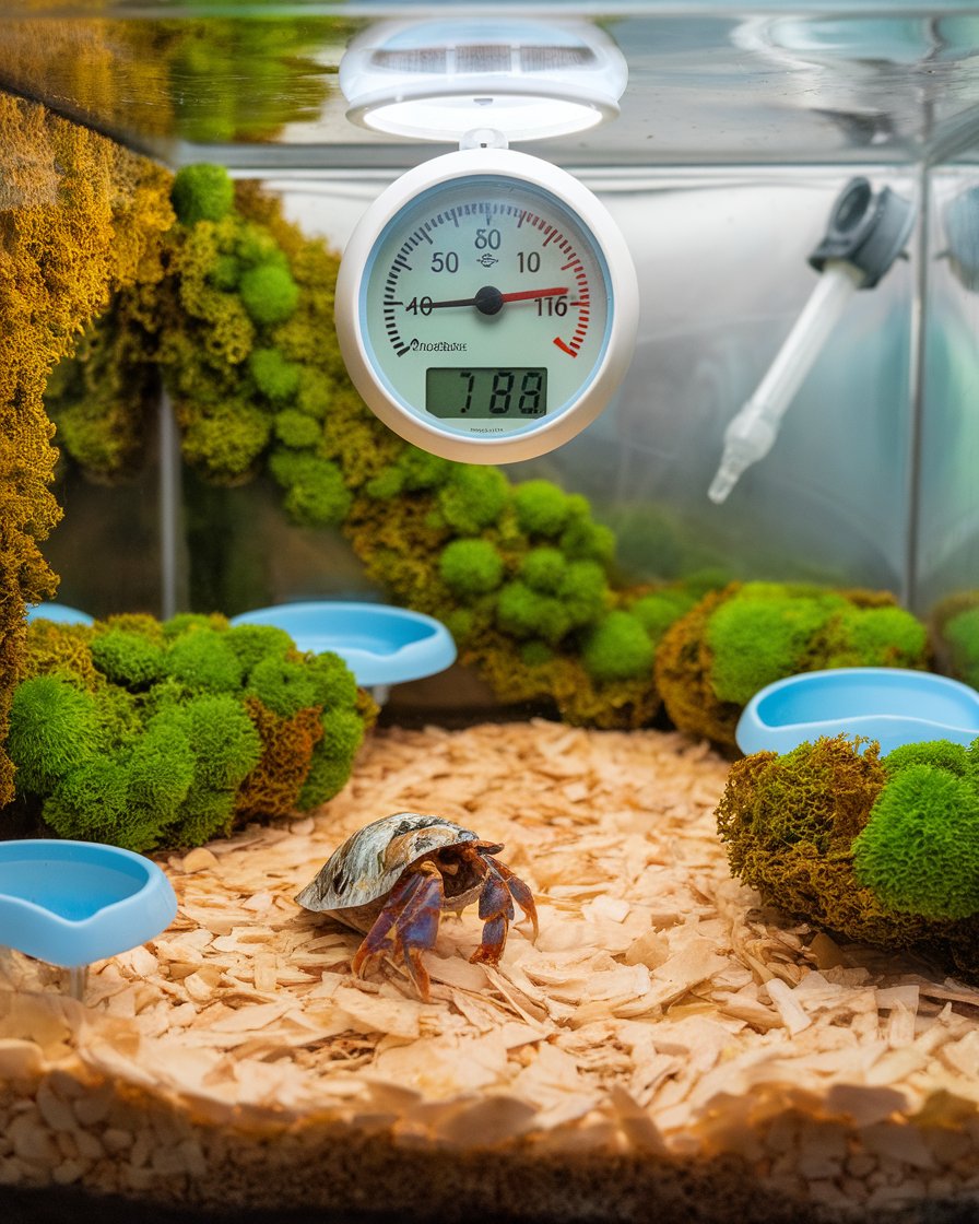 A hygrometer is an essential tool for hermit crab habitats, allowing owners to track humidity levels accurately. With a digital or analog hygrometer, pet owners can check if the tank’s humidity remains within the safe 70-80% range. Regular monitoring ensures immediate action if levels drop, helping to prevent potential health issues. For optimal results, position the hygrometer at a central tank location, away from direct heat sources. Calibrating the hygrometer periodically can improve accuracy, while adding items like sponges or moss in the tank helps stabilize humidity, keeping the environment consistent and safe.