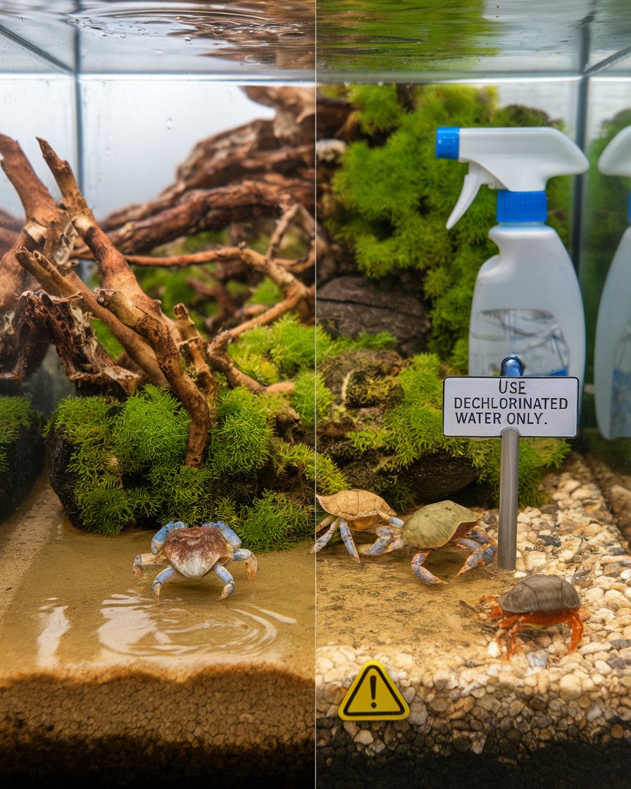 Tap water often contains chlorine, which can be harmful to hermit crabs when used for misting or drinking. Using dechlorinated or distilled water protects the crabs’ sensitive gills and overall health. Chlorine-free water can be easily obtained by treating tap water with drops or using bottled distilled water from a pet store. This small but important adjustment helps prevent respiratory problems and makes the habitat more comfortable and safe for hermit crabs. Regular checks on the tank’s water sources will ensure that no harmful chemicals are introduced accidentally.