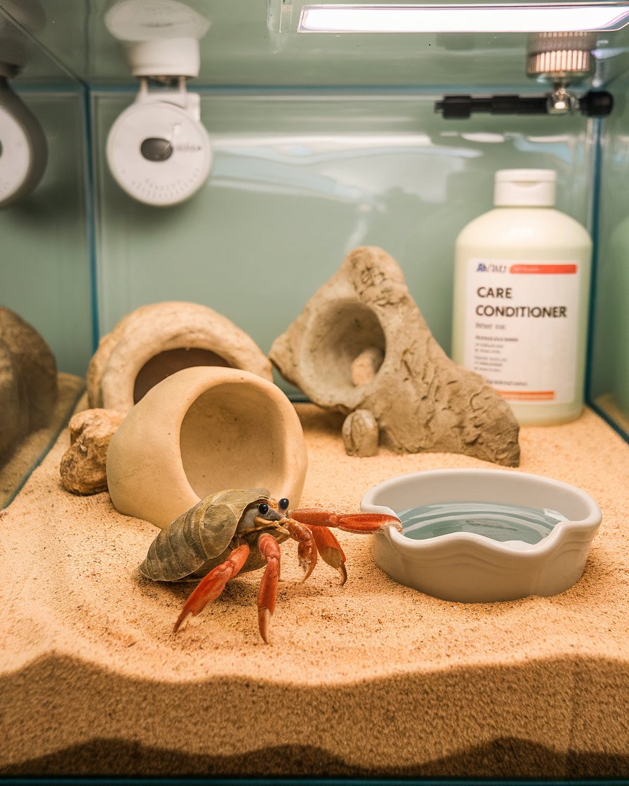 Choosing the right bedding for your hermit crab’s enclosure is super important. It needs to be deep enough for your crab to burrow, which is something they do a lot, especially when they molt. You can go for coconut fiber or sand, both of which are great at holding moisture and keeping the humidity just right. The bedding should be at least a couple of inches deep, giving your hermit crab plenty of room to dig. A good choice of bedding also helps manage the temperature and fights off bacterial or fungal growth. Regularly misting the bedding with a water conditioner-treated spray will keep everything nice and damp. Also, using a care sheet and adding ceramic items to the setup will keep the space clean and comfy. Don’t forget to use a conditioner for the water in the aquarium to keep the crabitat — temperature stable and healthy.