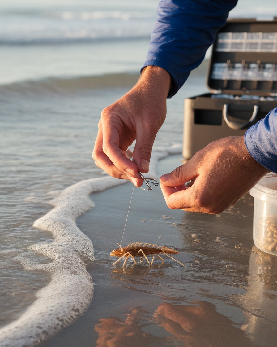 There are different techniques to hook sand fleas, and choosing the right one is key to successful saltwater fishing. One method is to thread the hook through the sand flea’s back, ensuring the barb remains exposed for a better hook set. This technique helps the flea stay attached while mimicking the natural prey of fish like whiting and redfish. Another method involves gently piercing the flea through its soft shell to avoid damaging its body. Depending on the size of your flea and the fish you’re targeting, you’ll want to select the right hook size—usually a kahle hook in the range of 2 to 6. With the right technique, you can keep the flea lively, improving your odds of catching fish along the shoreline.