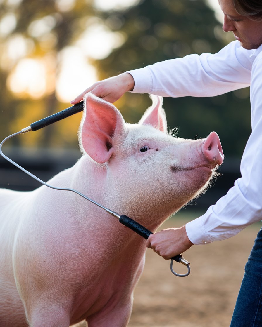 Once your pig feels comfortable, it’s time to introduce the show whip. The key is to do this slowly, ensuring the pig doesn’t become afraid of it. Using the whip to guide their movements, gently touch underneath their chin to encourage them to hold their head high. This is an important part of getting your pig ready for the show ring. Respecting the whip is crucial, as it helps them understand direction without instilling fear. With patience, your pig will learn to respond well, making them show-ring ready.